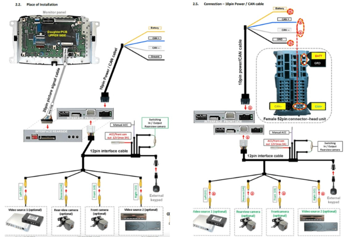 - The interface ONLY feeds video signals into the infotainment system. To feed in audio signals, a factory audio AUX input or an FM modulator can be used. If 2 AV sources are connected, additional electronics are required for audio switching.