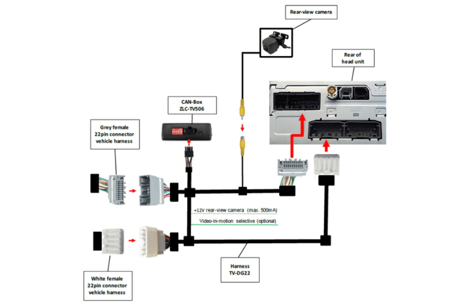 This interface allows for the connection of a rear-view camera to the cars factory navigation system. Only compatible for cars with Uconnect 5 inch or 8.4/ RB5 and 8.4/ RE2 system monitors with 22 pin connector.