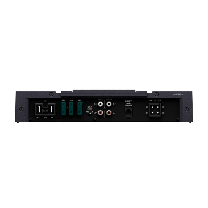 The HDA-M80 Mono Power Amplifier features a Class-D amplification circuit with Sierra-H technology (see below for more details on Sierra-H). It features an RMS power output of 1x 500 Watts @ 4Ohm or 1x 800 Watts @ 2Ohm and a frequency response of 8Hz to 400Hz (-3dB).